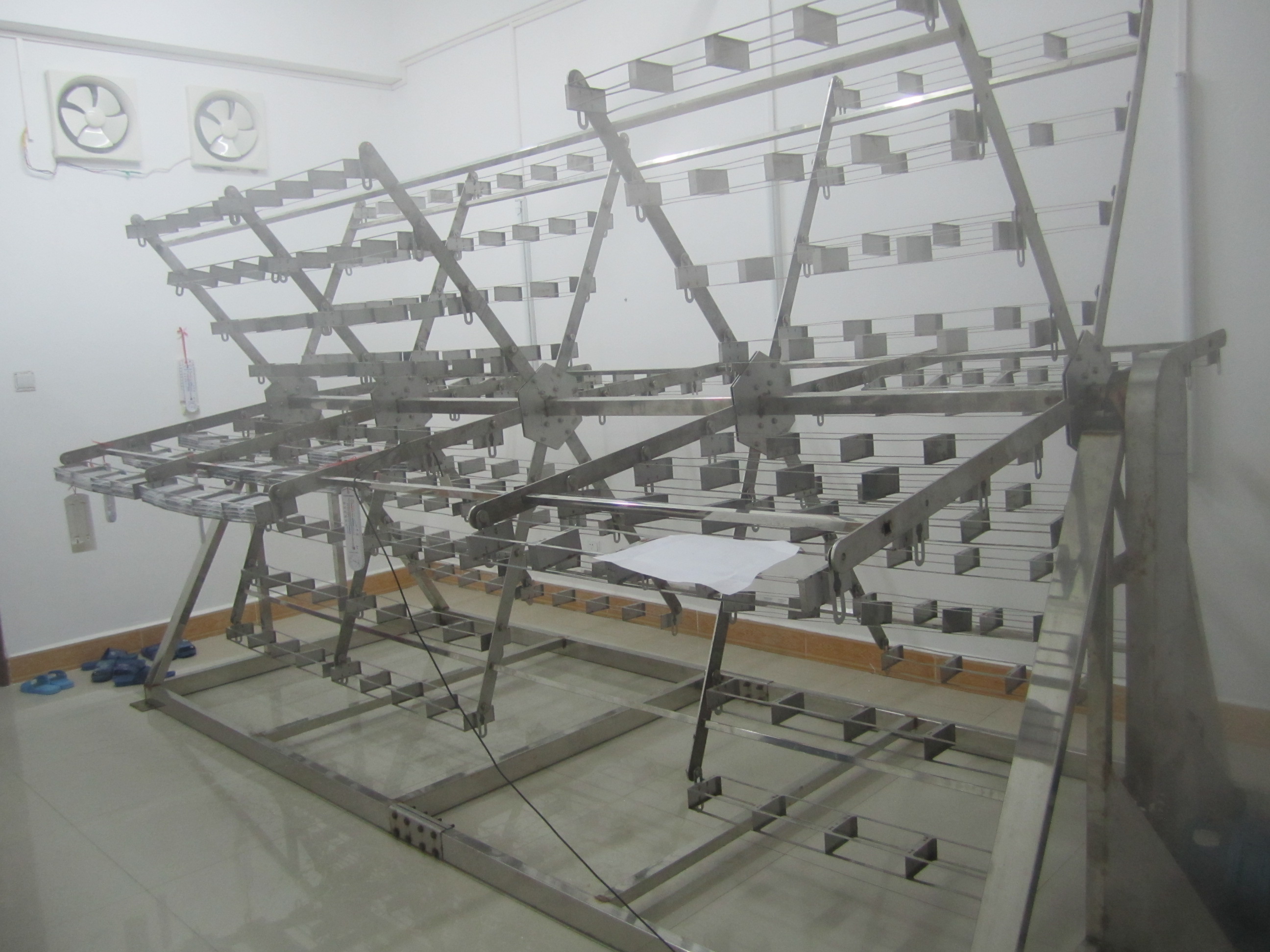 由四川南充上智农业机械设备有限公司与四川省蚕研所共同研制的新一代自动化烘茧设备。该机属多段落回转式热风烘茧设备,冷空气经加热至设定的温度后,由送风系统按蚕茧干燥工艺要求送入烘室,同时鲜茧经自动铺茧装置送入在烘室内至上而下沿水平方向做段落回转移动,经过高、中、低三个温区,被干燥的蚕茧由出茧机输出,冷却后装包。主要突出节能环保、运行稳定、省工省力、品质高。